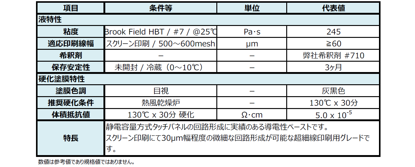 スクリーン印刷による細線回路形成が可能。主に静電容量方式タッチパネルの導電回路に適しております。